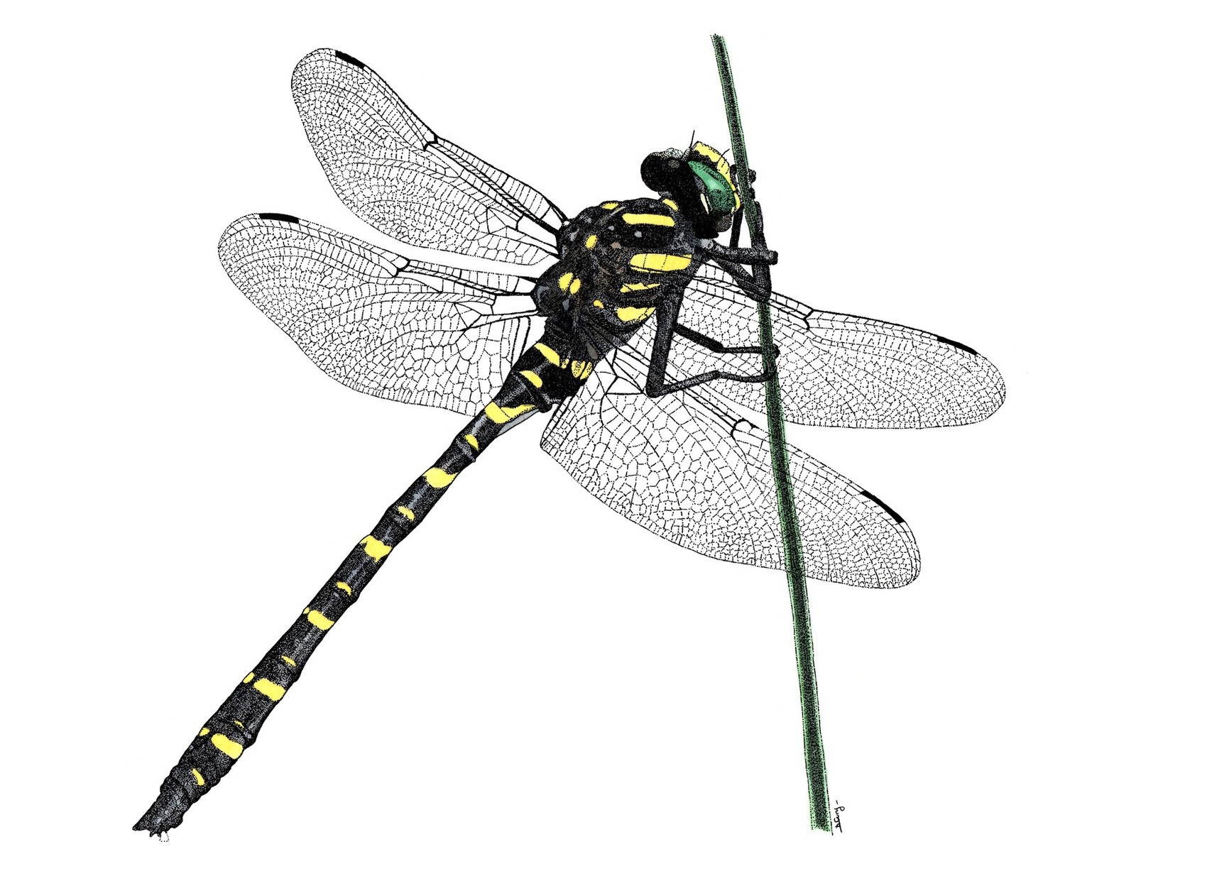 Voici un petit hélicoptère jaune et noir... aux yeux verts Cordulegaster boltonii Encre de chine et aquarelle, d'après photo