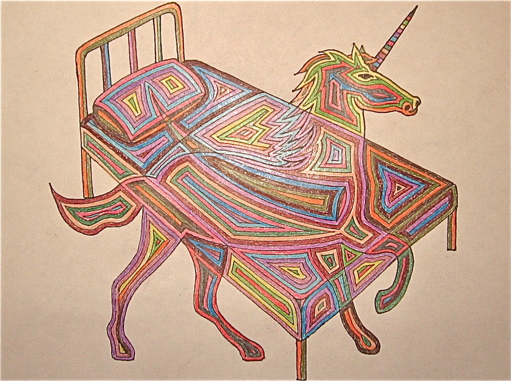 Dessin au crayon de feutre noir et crayons de couleurs.