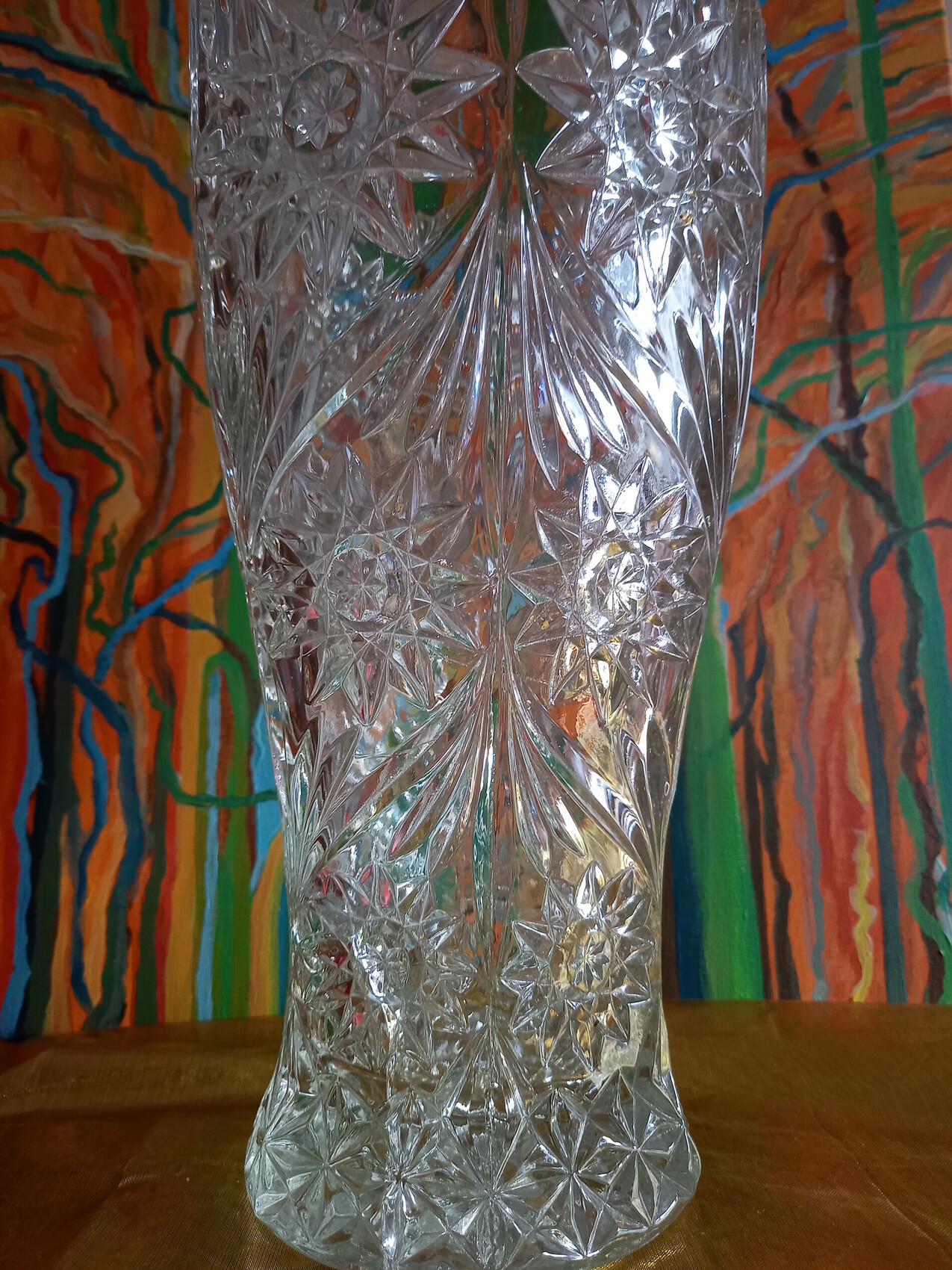 Photo. Vase année 60 environ, avec un de mes tableau en fond et nappe dorée.