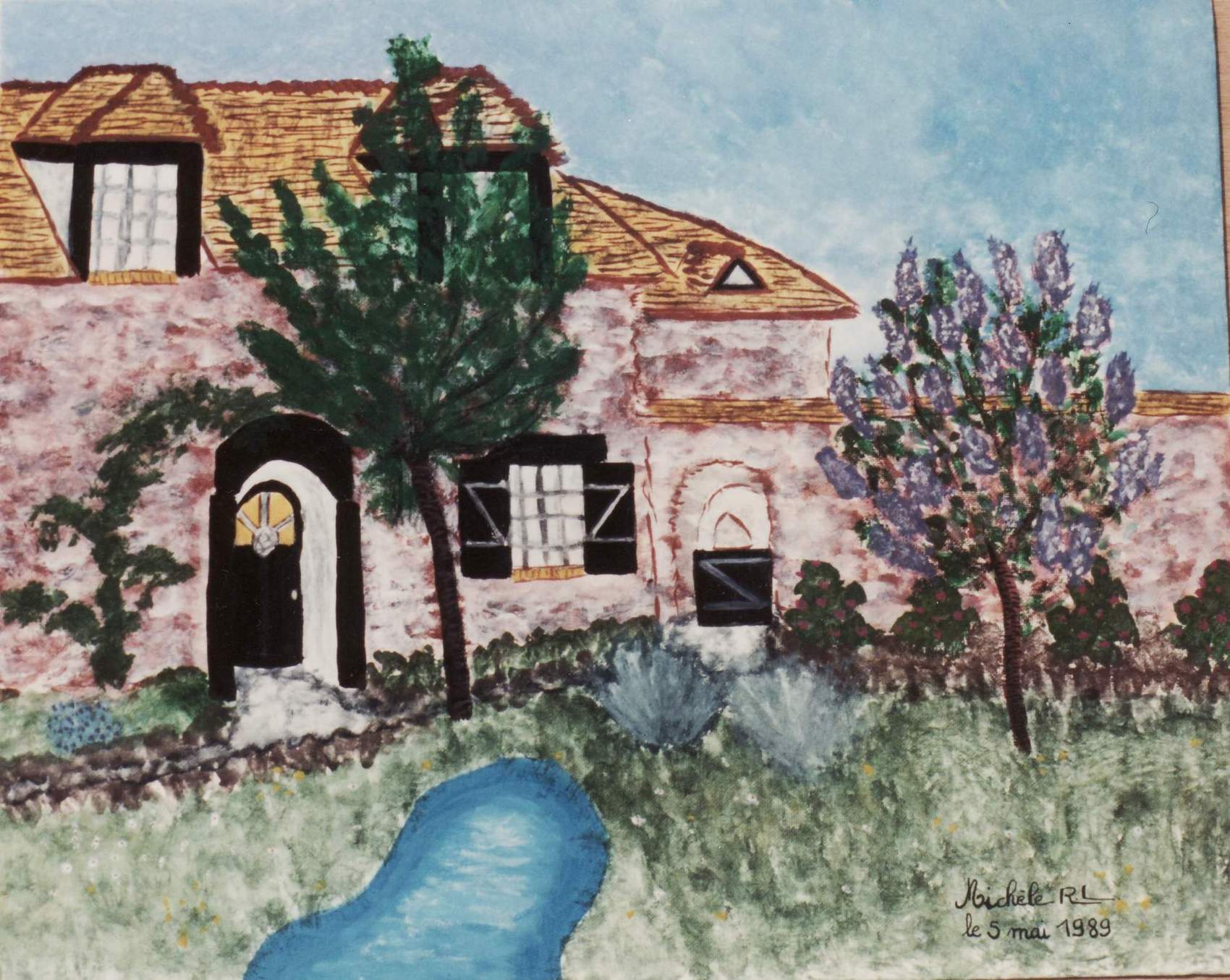 (30x40 - gouache - carton entoilé) Passé, passé-composé, passé-compliqué... Une partie de ce qui est encore ma maison. Bâtisse en pierres du pays, créée dans une vieille grange de quatre murs existants et d'une toiture écroulée au milieu d'un terrain abandonné à l'époque, mais pas dans le sud de la france, en Île-de-France. Elle y a abrité mes vieux os durant vingt-quatre ans. Toile réalisée un peu comme une peinture d'art naïf. canelle