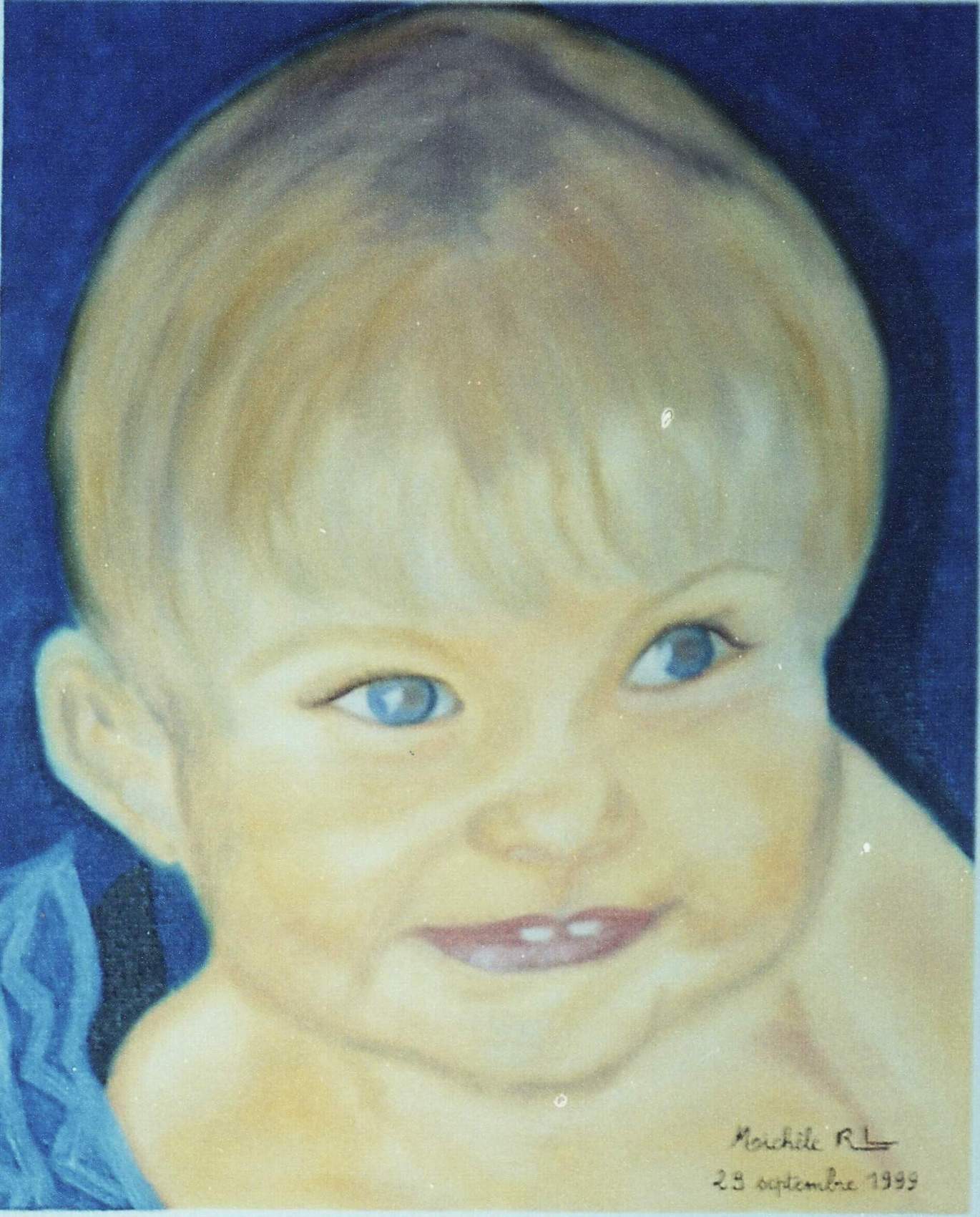 (50x60 - huile - toile sur chassis) Cette toile représente ma petite-fille à l'âge de dix mois, blonde comme les blés, avec ses deux petites dents. Je l'ai réalisée d'après une photo-poster que j'avais pris quelques jours avant, en vue de l'offrir pour l'anniversaire de ma fille. Je l'ai fait en deux soirs. Les tons chair, le premier soir, les tons bleus le second soir. J'aurais bien voulu vous mettre là cette photo, mais malheureusement, comme tout le reste, elle est restée derri