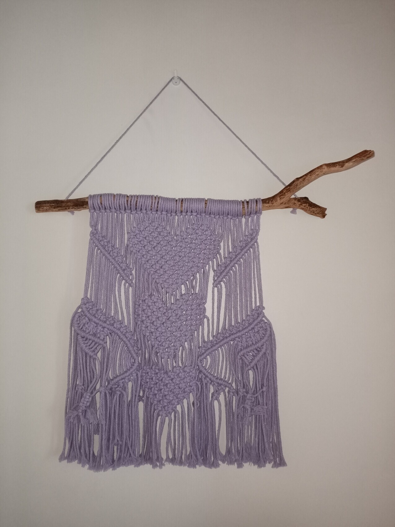 Macramé mural réalisé avec du fil 2mm en violet et comme support du bois fin