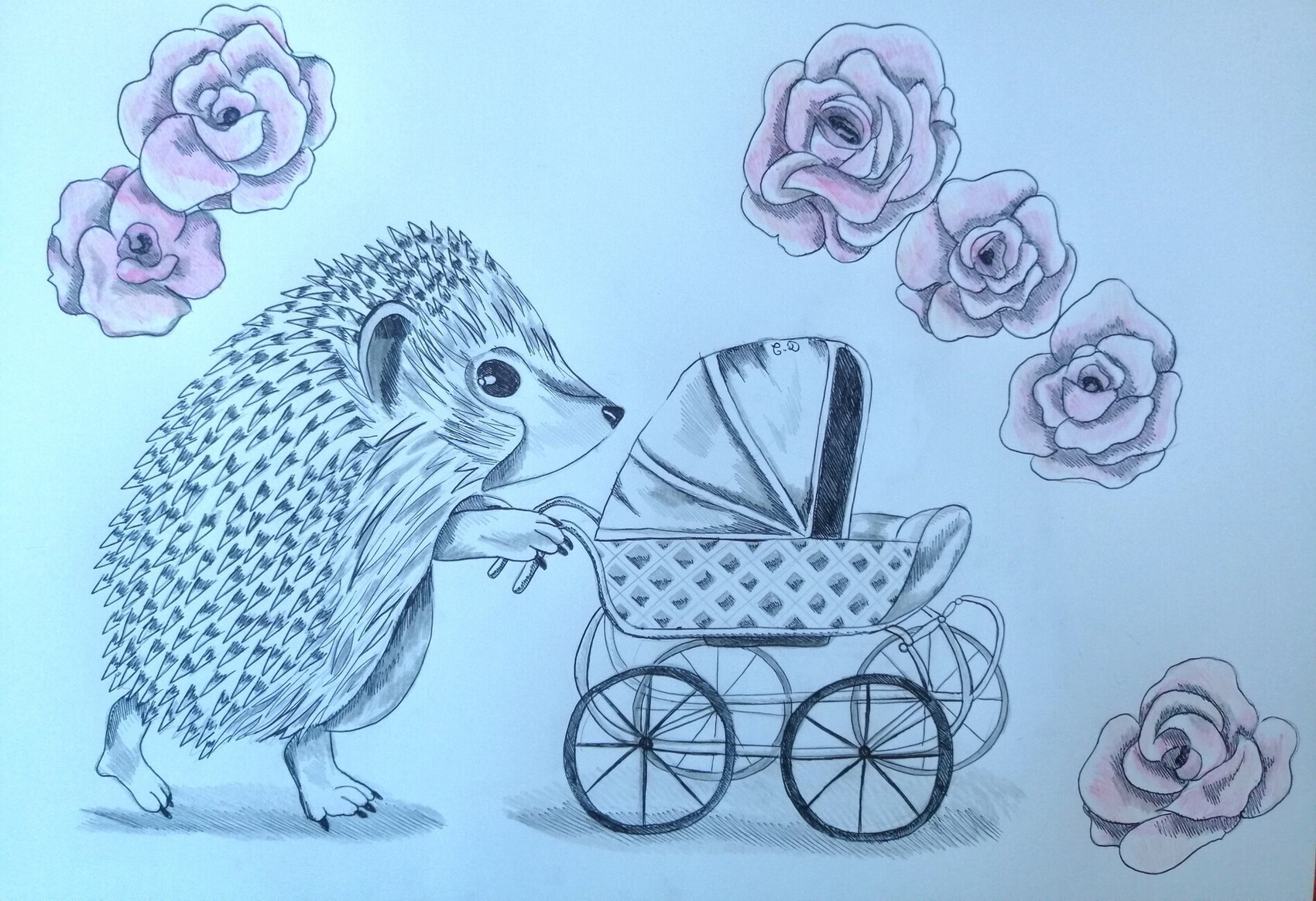 Illustration hérisson et landeau format A3. Stylos et crayons. Le 20/01/2020.
