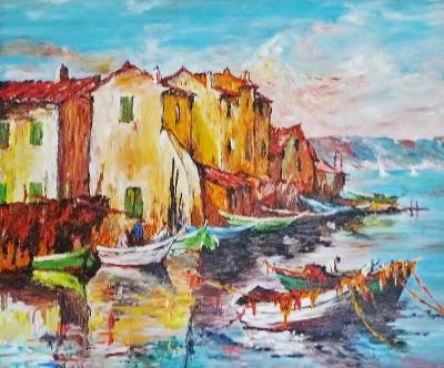 Huile sur châssis.Travail au couteau. Tableau réalisé à l'âge de 19 ans.Actuellement, aucun intérêt de peindre Martigues!