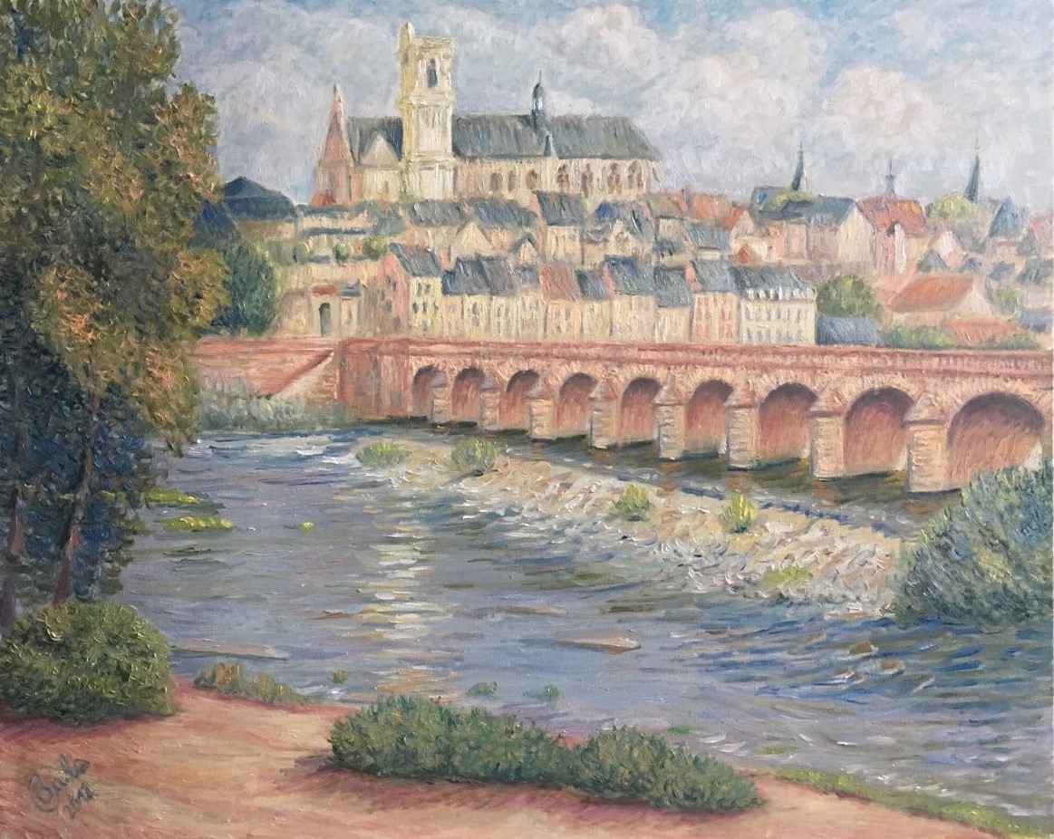 Huile sur toile (65 x 81) Par ces temps de chaleur, on ne peut vivre qu'au bord de l'eau...Le vieux pont de pierre scinde en deux parties la toile : la surface de la Loire exerce le contrepoids de la masse des maisons de la ville, couronnées par la cathédrale, s'étirant fièrement au soleil de la matinée. Bleus d'ardoise, jaunes de Naples, rouges orangés composent l'atmosphère de base de ce tableau.