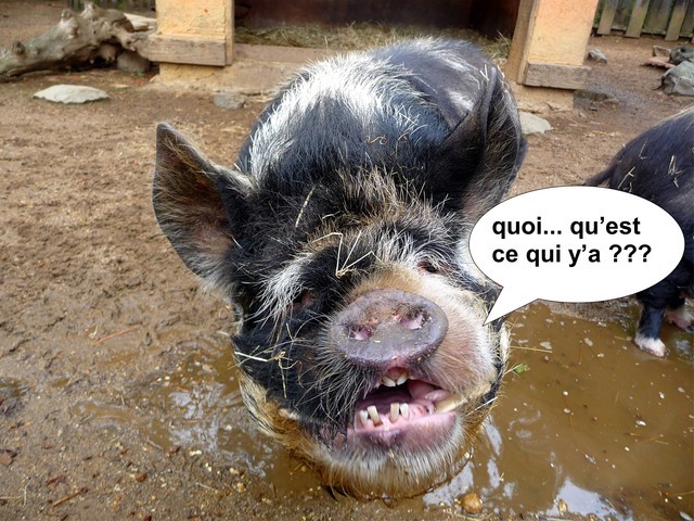 La photo est très drôle et le moment est très bien saisi - une vraie réussite. Moi ,ce qui m'interpelle c'est ce côté humain un peu dérangeant chez ce cochon. Est-il le fruit du hasard ou une modification subie ? On ne le saura pas.