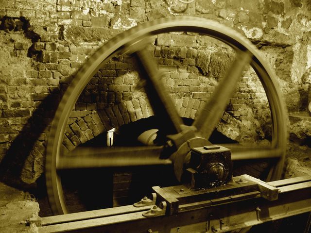 Roue en mouvement, moulin à eau Grand Fayt (59). Juin 2008 Sépia