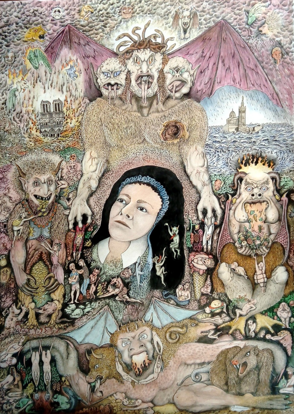 Dessin au crayon mine de graphite, couleurs à l'aquarelle. Ce dessin représente la vision apocalyptique de Mélanie Calvat.