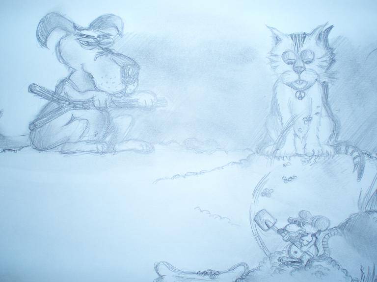 chien chat souris copains comme cochons : dessin au crayon a papier.