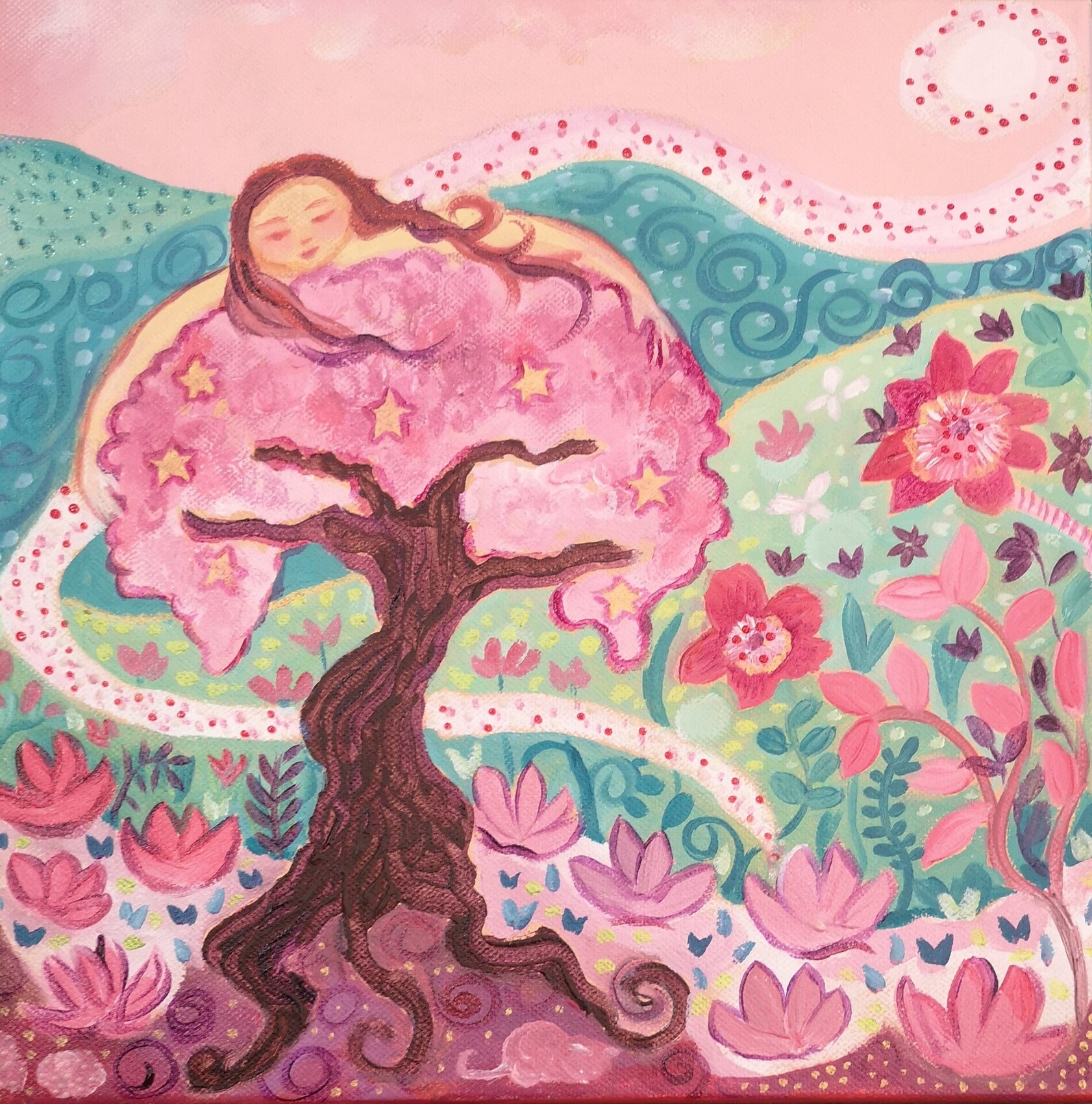 Aimer la nature , la protéger du mieux qu'elle peut , petite mère nature , câline et protectrice, enlace l'arbre de ces petits bras fragiles. dans les tons de rose et vert