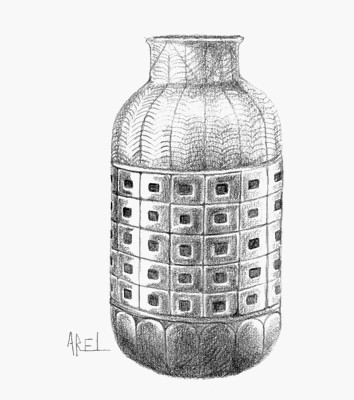 Crayon sur papier 30x42 cm. Cette oeuvre a été réalisée à partir d'un vrai pot. Ici le crayon est utilisé dans les trois gradations; cela permet d'obtenir des noirs bien saturés sur les carrés en creux.