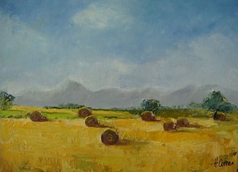huile sur toile, format 20 x30, représentant la plaine de la Limagne,les meules de foin et en fond, le Puy de Dôme