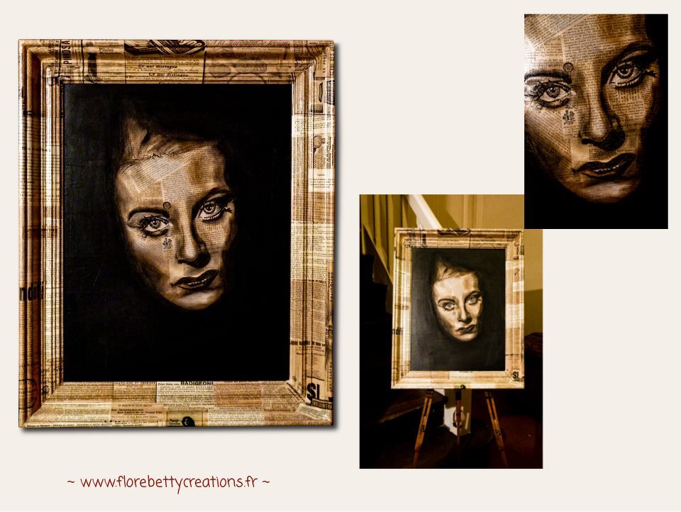 Portrait de Michèle Morgan sur coupures papier de la revue française "Le Petit Echo de la Mode" du 14 juillet 1907. Acrylique et fusain sur papier journal. Cadre en bois recouvert des mêmes coupures. " - T'as d'beaux yeux, tu sais ? " Qui ne connaît pas cette réplique prononcée par Jean Gabin face au magnifique regard de la très jeune Michèle Morgan, dans l'inoubliable "Quai des brumes" de Marcel Carné en 1938 ? Grande dame du paysage cinématographique français, elle recevra