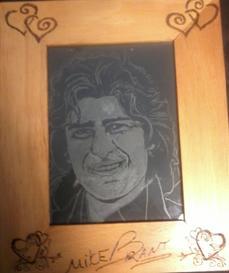Portrait réalisé en gravure sur verre à partir d'une photo. Cadre pyrogravé à la main.