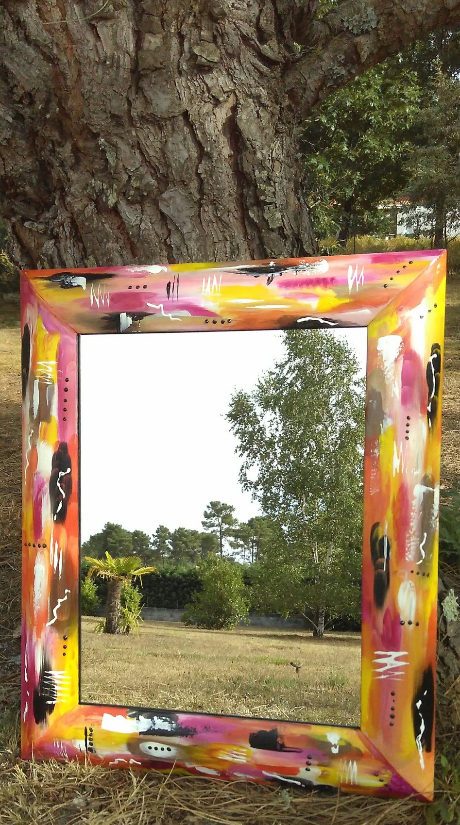 miroir contemporain acrylique 42x60 Pièce unique et signée. Baguette bois bombée. Toit miroir peut être réalisé aux dimensions souhaitées, aux couleurs de votre intérieur avec possibilité du choix de la baguette (bombée,plate, façon caisse américaine)
