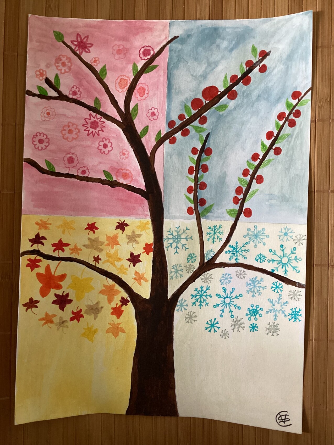 L’arbre au fil des saisons. Mélange de peinture acrylique, d’aquarelle et de feutre.