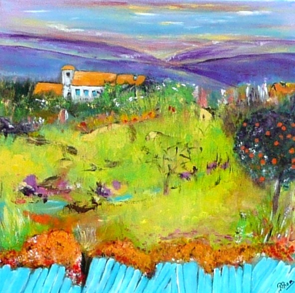 Peinture sur toile 40x40 Acrylique 160€ D'abord un champ, puis une barrière avec un ciel en arrière fond, puis un cours d'eau est apparu. A travers la végétation j'ai commencé à entrevoir des bâtiments et le mas est arrivé avec ses champs de lavande. L'orange des toits m'a ramené à un livre de Vasconcelos que j'ai beaucoup aimé et j'ai planté à mon tour mon pied d'oranges douces.