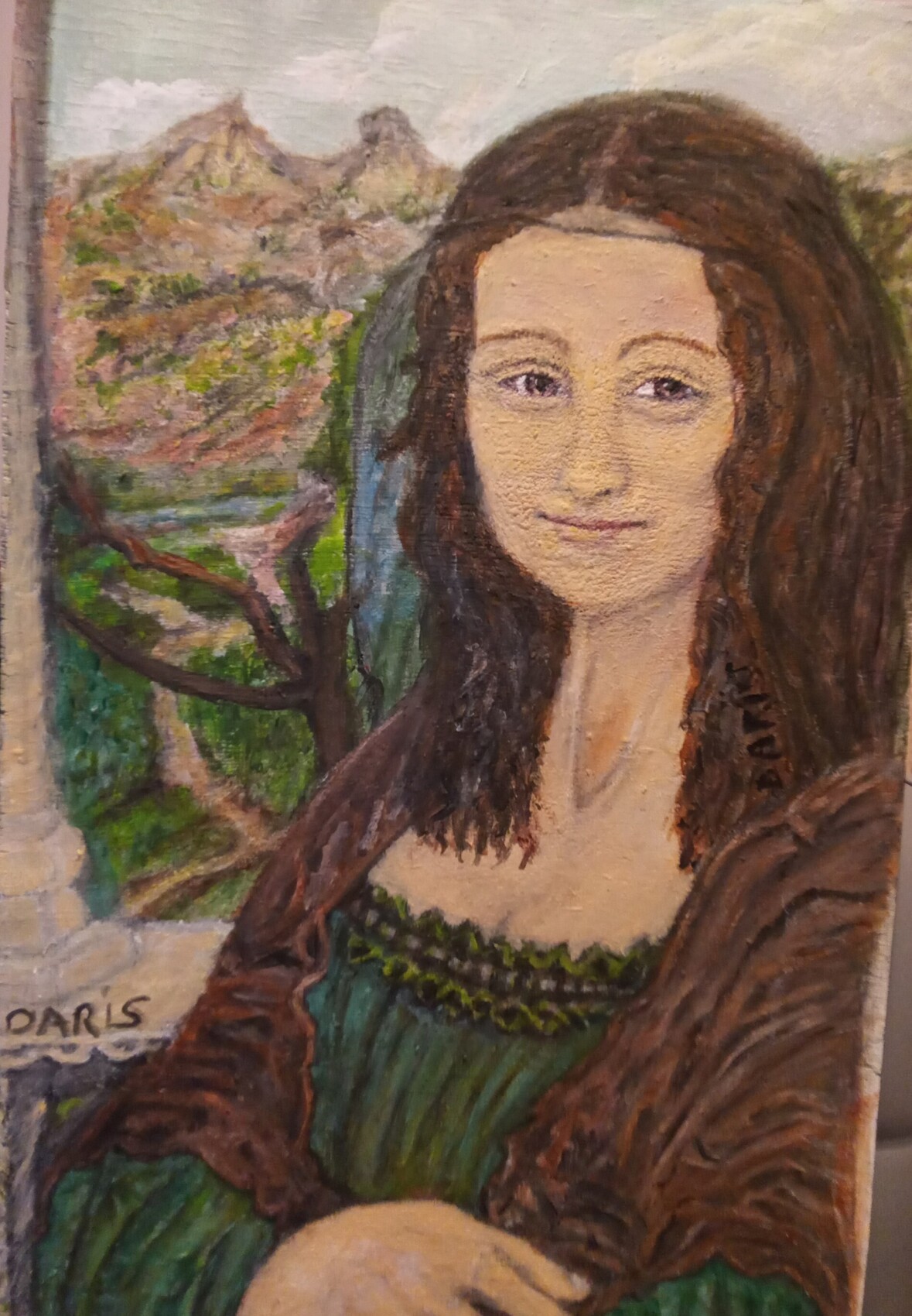 Mona Lisa ou la Joconde transportée dans les montagnes de l'Atlas en Algérie. Une idée surgit lors de la découverte d'un panneau de bois du merisier et non du peuplier. Un exercice difficile de tenter de capter un peu de l'oeuvre du Maestro. Des semaines de repentir et beaucoup d'émotions J'ai imaginé que cette femme nous fixe pour éviter que nos yeux regardent les doigts qui froissent une lettre, un secret