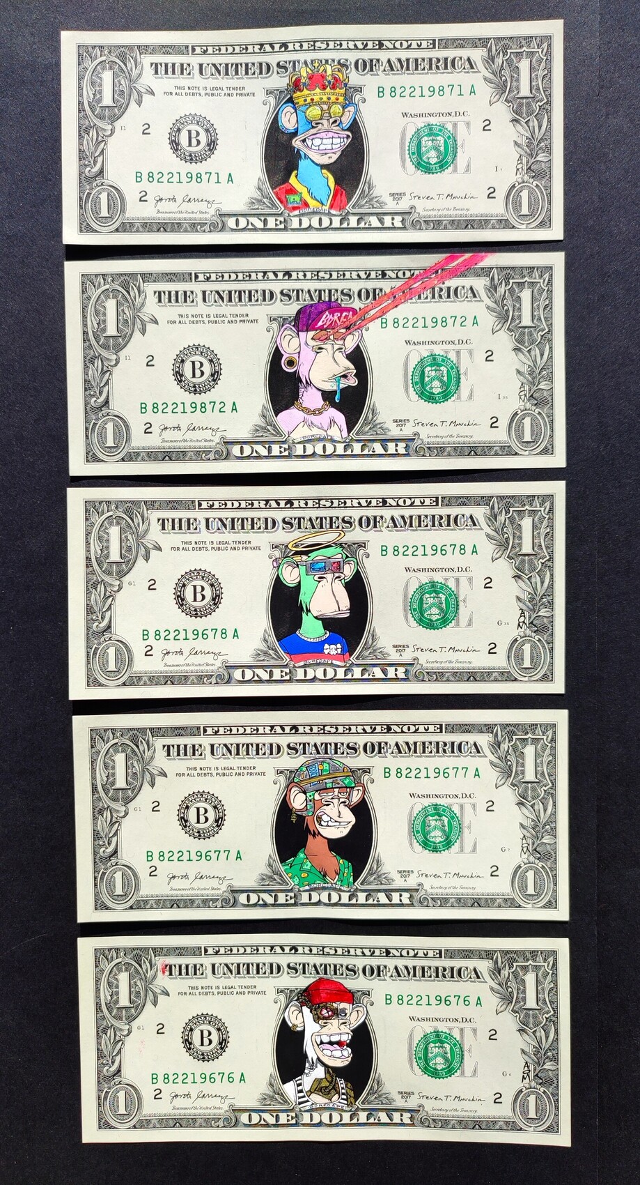 -Creation réalisée en 2022 sur 5 vrais billet de 1 dollar américain -jai créer spécialement une série de 10 BORED APE pour une galerie d'art ,sur cette photo il n'y en a que 5 -Utilisation des feutres peinture POSCA -CERTIFICAT DAUTHENTICITÉ -NON DISPONIBLE/VENDUS -PLUS DE PHOTOS, VIDEOS ET CRÉATIONS SUR INSTAGRAM :arts_of_monkey -Petite explication sur le prix 100euros l'unité=500euros Jai pleurer quand j'ai vu a quel prix la galerie les revendait..Plus de 300euros l'unité..
