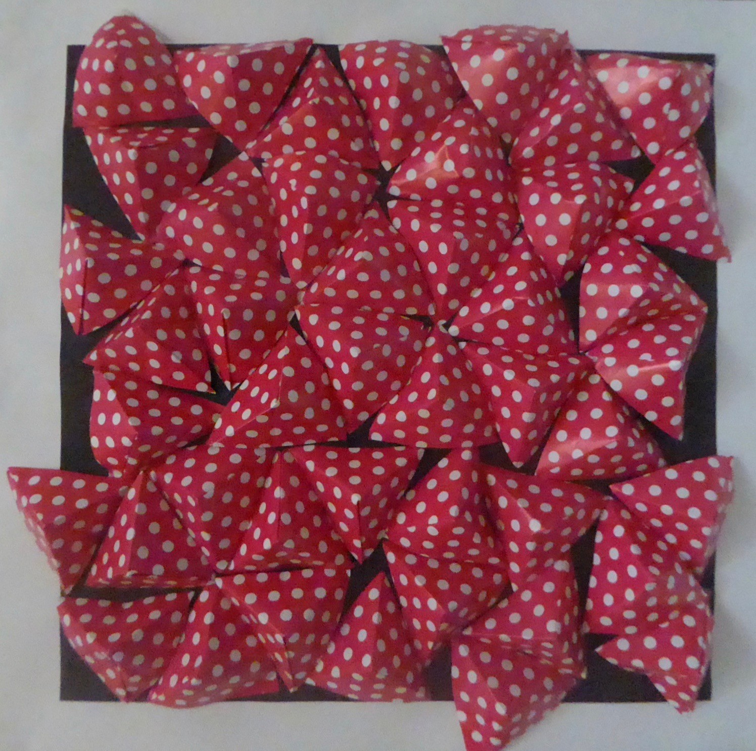 Pliages origamis en 3 D collés sur carton. Dimension finale : 35 cm x 35 cm.