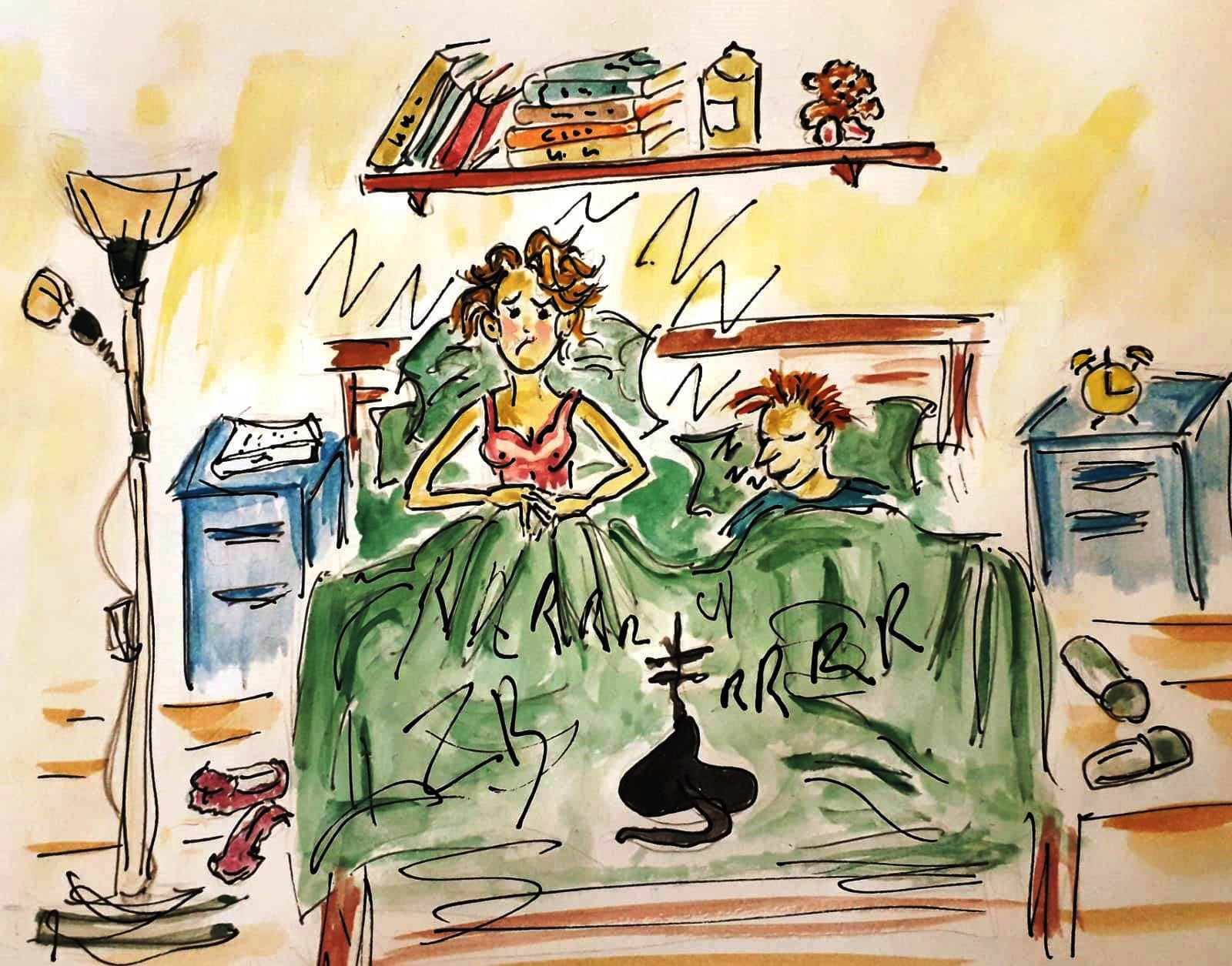 acheter lui un appareil qui empêche de ronfler du moment que ça ne l'empêche pas de dormir ! enfin si ça marche ! :)) et changer la couleur de votre chat , sa couleur n'aide pas non plus ! :)) amusante illustration , j'aime bien voir les pantoufles au pied du lit je ne sais pas pourquoi d'ailleurs ! :)) encore bravo ! :)