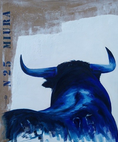 toro bleu de miura, huile et collages sur toile format 10F, 55x46 contact 06.64.46.48.27 en vente sur demande (250 euros pour ce format)