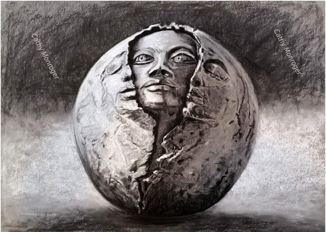 Fusain et craie blanche sur feuille grise 50x70
