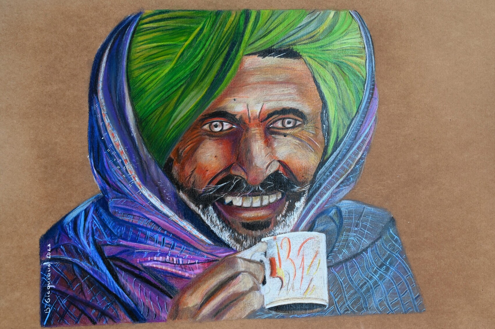 Portrait sur papier KRAFT épais aux crayons de couleurs DERWENT a mine tendre et mine dure format 50x65cm