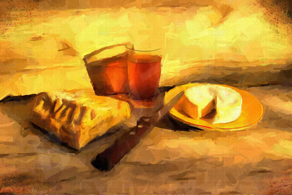 Nature morte aux pain, vin et camembert...