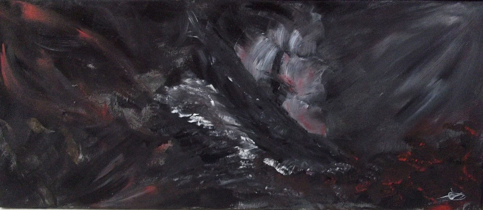 Acrylique h: 25cm l: 60 cm Bateau dans la tempête, jeu de nuances rouges, noires et blanches.