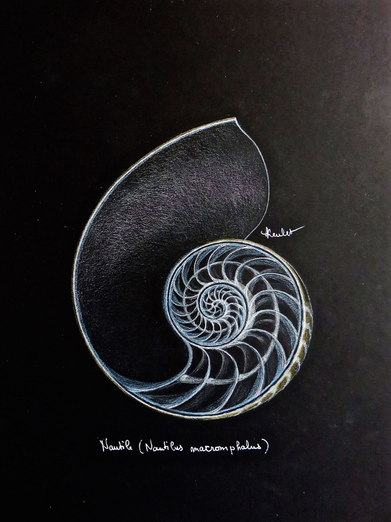 Crayons de couleur, février 2020, 32 x 24 cm. Dessin d'après nature de la magnifique coquille de ce céphalopode carnivore qui était là avant les dinosaures . Article sur mon blog Artnaturl = Muriel REULET = Coloured pencils, 2020. Naturalistic drawing of the magnificent shell of this carnivorous cephalopod that was there before the dinosaurs. You can read the article about this work on my blog Artnaturl,