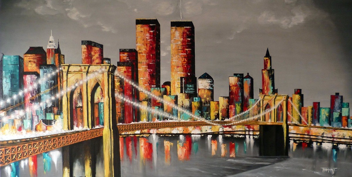 Peinture à l'huile de New York, tons chaud, couteau et pinceau. Voici ma vision de New York et de l'incontournable pont de Brooklyn (Brooklyn bridge), ville animée, vivante, colorée, multiculturelle... Toile sur chassis épais de 3cm : dimensions : 1m50 X 75cm
