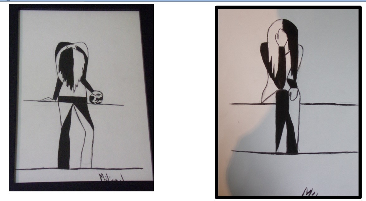 Encre de chine sur Canson : 2 silhouettes féminines jouant avec le contraste noir et blanc.
