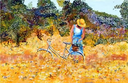Toile peinte en 2004 - Médium à l'huile au pinceau - Dimensions : L41 x H27 x 2cm - Représentation : Vision champétre et buccolique d'une jeune fille aux fleurs.