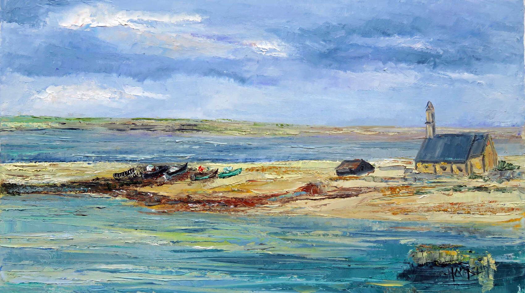 Huile sur toile travaillée au couteau de 46x27 cm œuvre unique. A Camaret, Notre Dame de Rocamadour sur son étroite langue de terre après la tour Vauban semble veiller sur le cimetière marin. Des œuvres s'inspirant du même sujet peuvent être réalisées à la demande. L'envoi peut être fait dans un emballage adapté sur mesure. Les frais d'envoi sont calculés en fonction des tarifs postaux, ils sont de 20 € en 2016 pour la France calculés au coup par coup pour l'étranger.