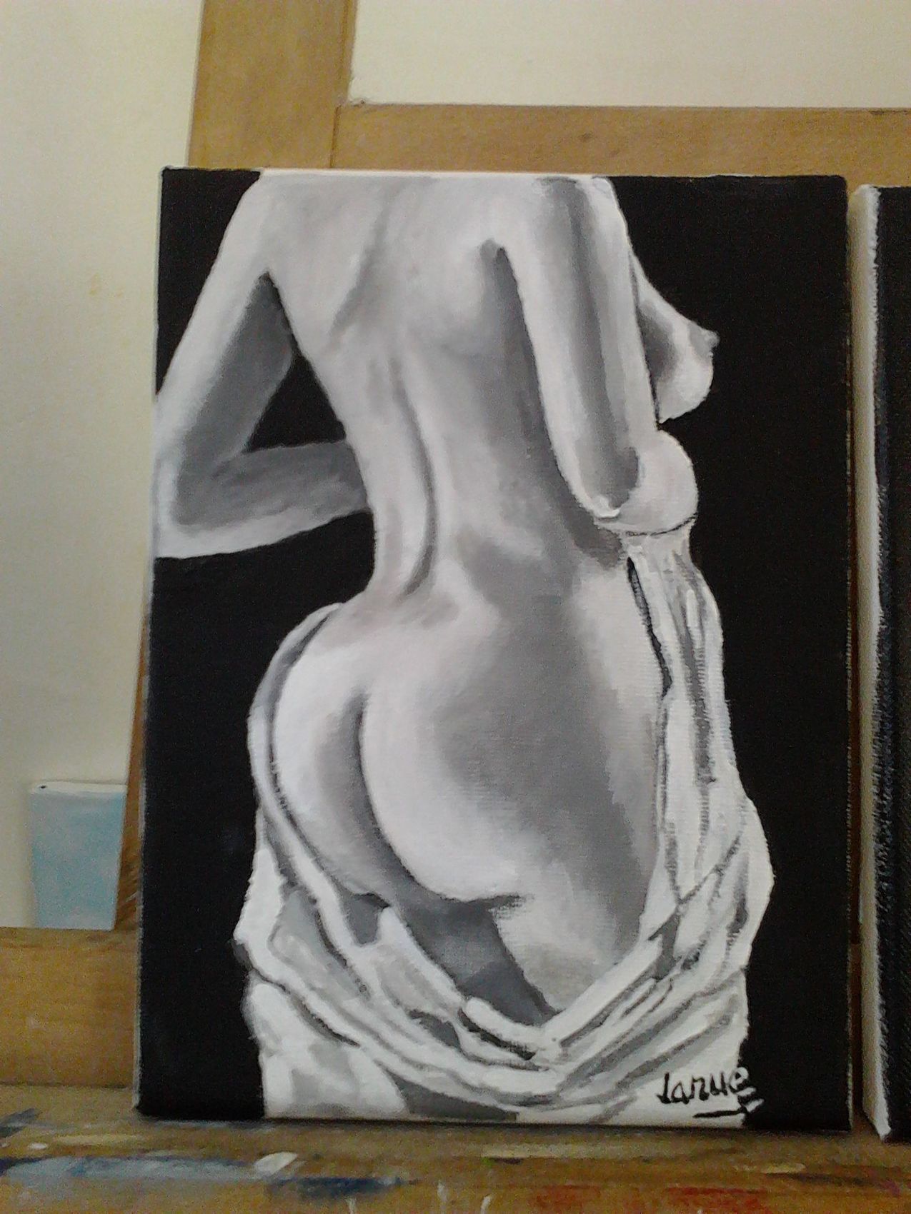 Acrylique, petit format. Inspiré d'une photo, j'ai aimé la pose et la lumière, en revanche j'ai ajouté des formes généreuses au modèle, parce que je peins des femmes aux formes que je considère comme étant idéales. "Toute représentation ou reproduction intégrale ou partielle faite sans le consentement de l'artiste est interdite"