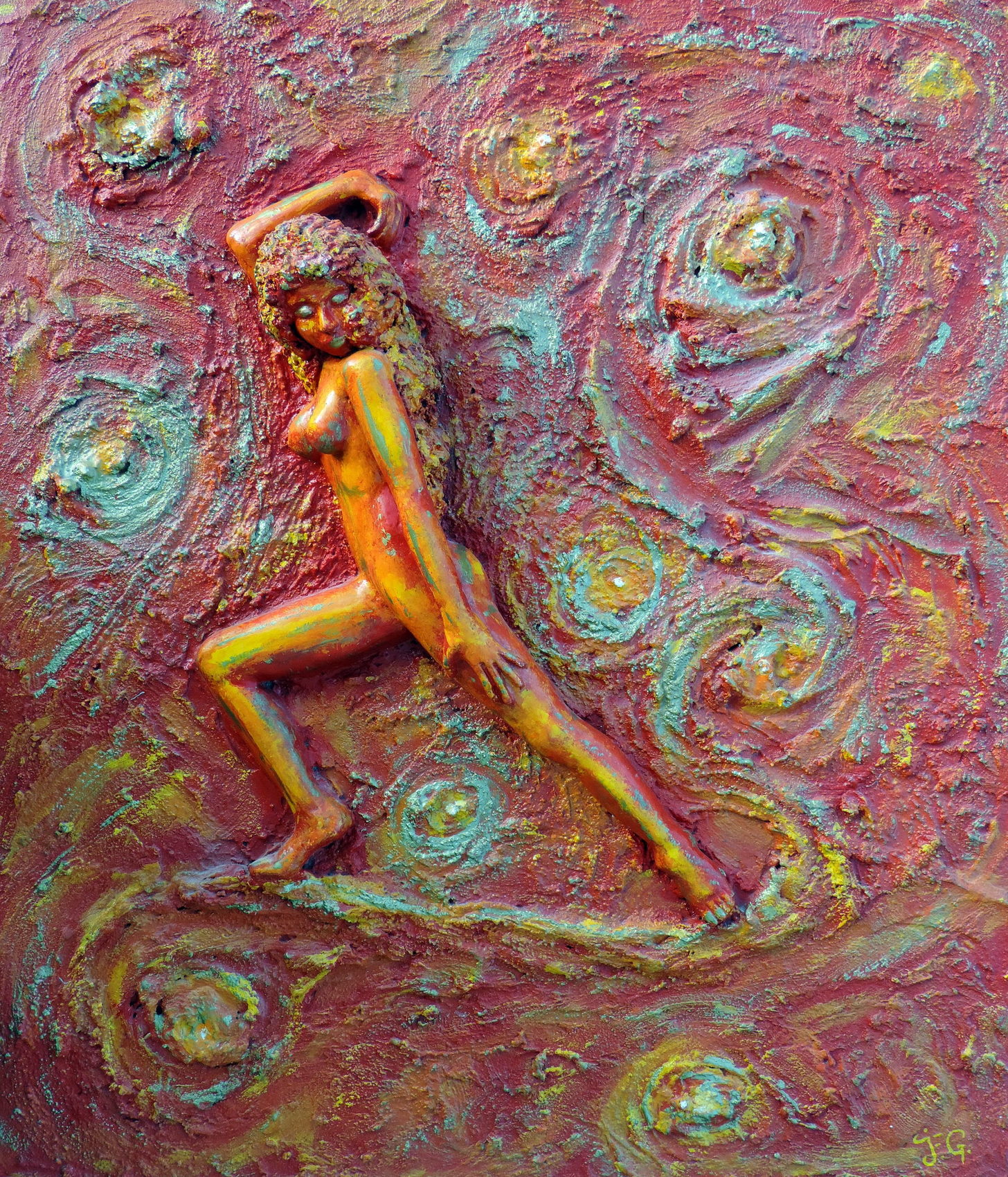 nu femme orange peinture en relief papier maché ajout de matériaux sur support bois Jean-François Gantner racontart.fr