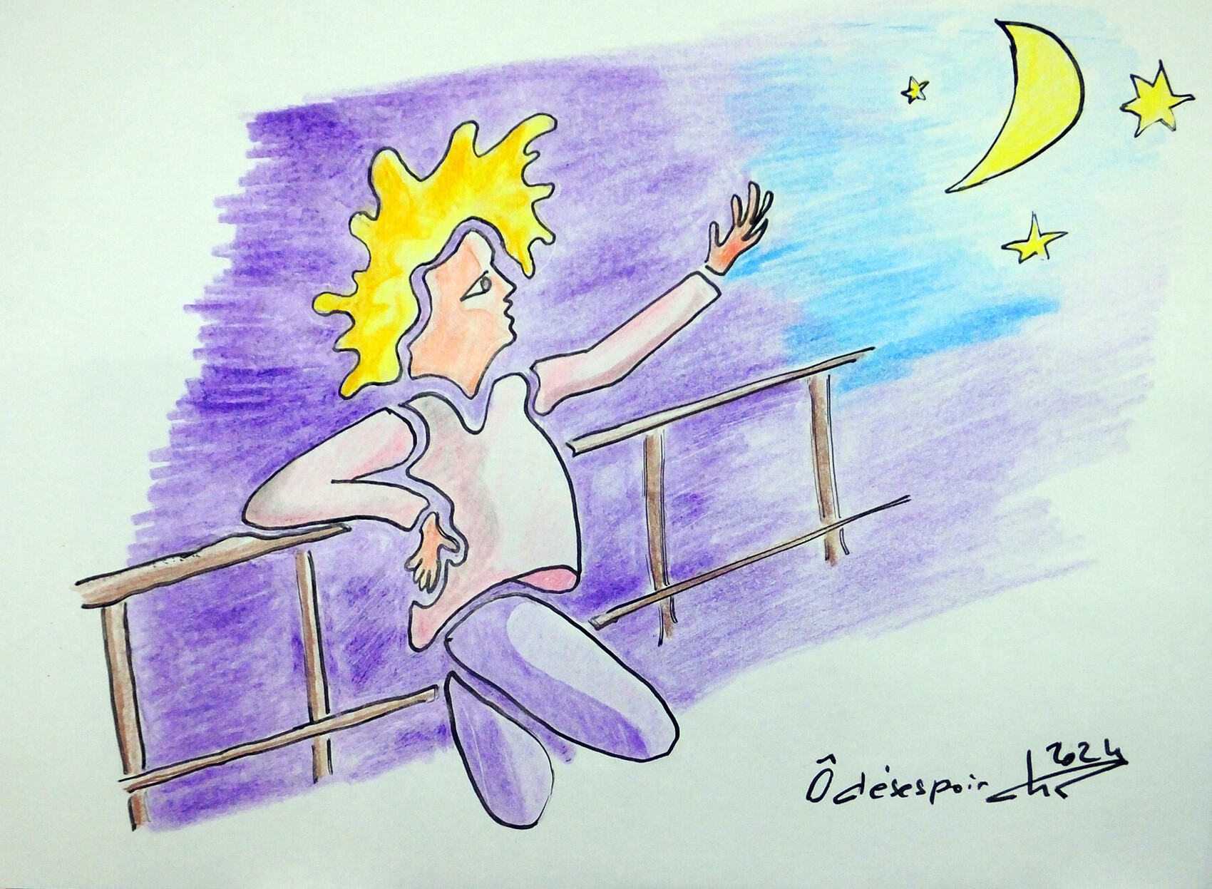O désespoir du poète déclamant ses vers sus la lune nocturne crayon sur papier A4