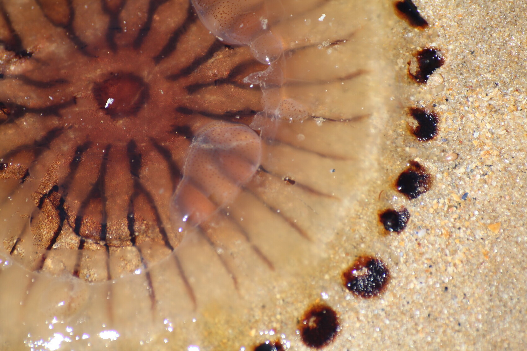 Sur la plage abandonnée gisait cette méduse. Le sable donnait un arrière plan uni et le cadrage serré, ne laissant apparaître qu’une partie de l’animal, permettait d’imaginer une pupille cernée de son iris. Les Sables d’Olonne (Vendée) – Juin 2015 Canon EOS 550 D – 100 ISO – 1/320 – f/6,3