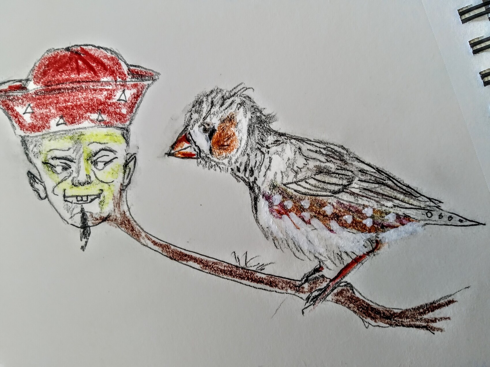 Bonjour, là encore j'éprouve une tendresse pour l'oiseau qui regarde avec pitié cet énergumène à 2 dents qui lui a volé une plume. Est-ce un créateur ¿ Bon délire suivant.