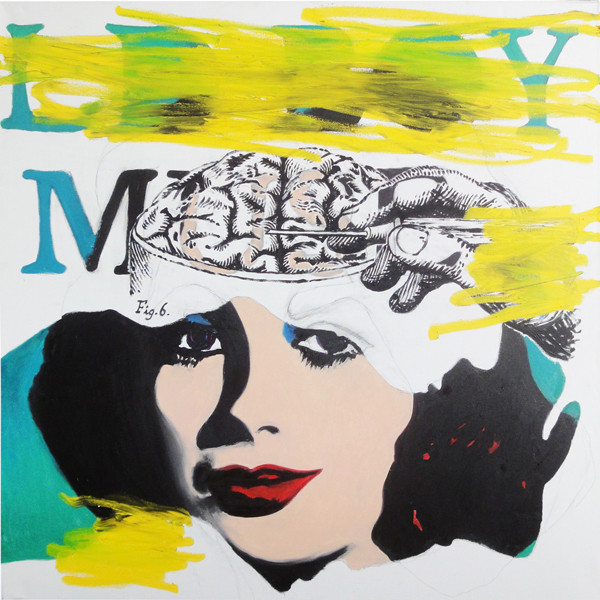 Mixte sur toile de 90 cm2 Septembre 2012, qui fait écho à "Muse amusée", un autre de mes tableaux de décembre 2010. Les deux reprennent des sérigraphies d'Andy Warhol, cette fois-ci il s'agit de Liz Taylor. Même série. Le fond blanc est le blanc de la toile.