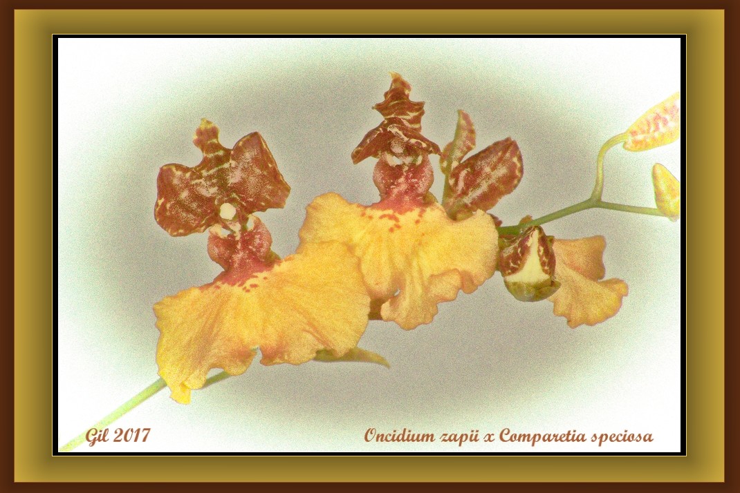 Voici une orchidée extraordinaire, un croisement réussi entre 2 orchidées de genres (comme si on croiserait une chèvre et un mouflon). De plus il est très florifère puisque, acheté en janvier 2017 avec une tige florale, il refleurit maintenant avec 3 tiges florales.