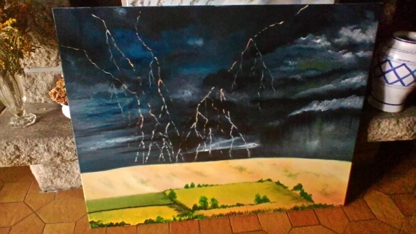 Orage en été. Les éclairs illuminent la campagne, le ciel prend les couleurs de la nuit...