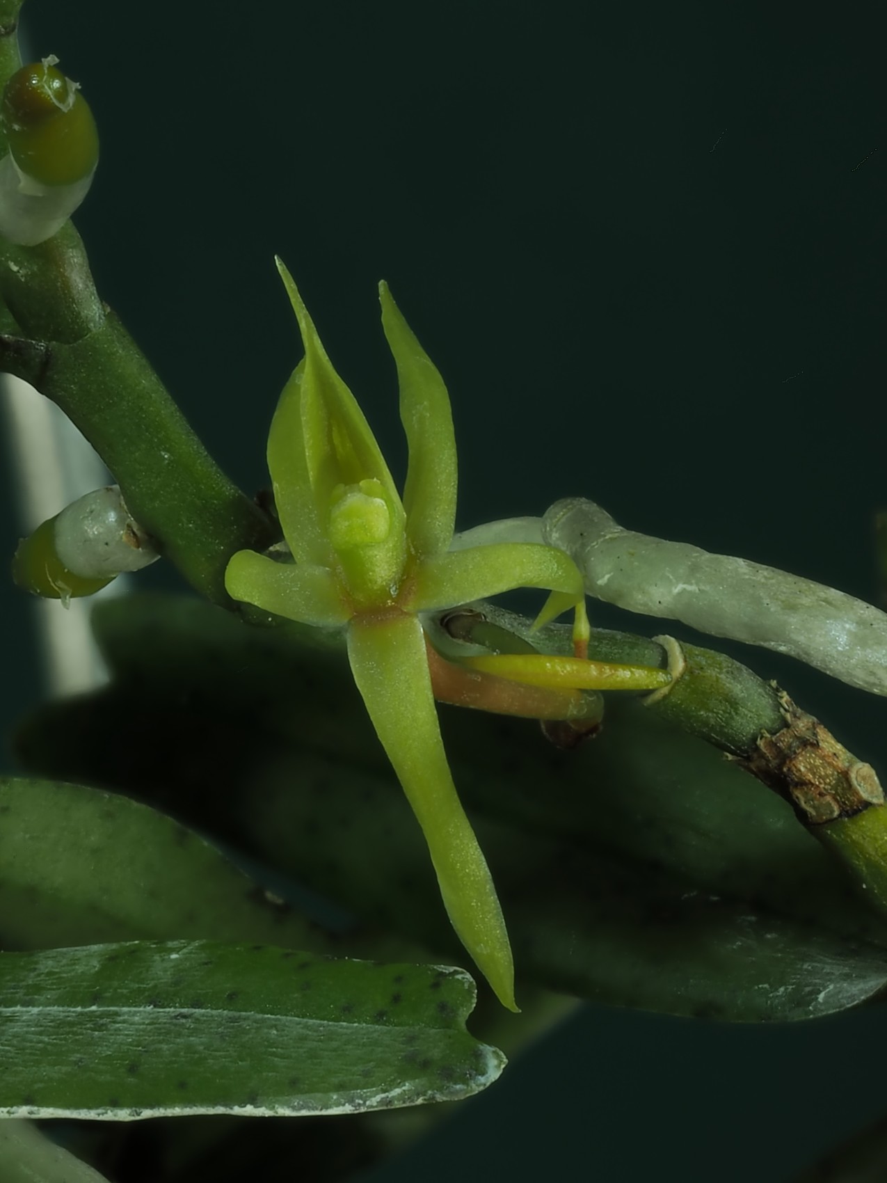 Angraecum chevalieri. C'est une plante à fleurs très petites (1cm max). Mais il y a une espèce avec des fleurs encore plus petites : Angraecum calceolus. Je vous la montrerai un jour.