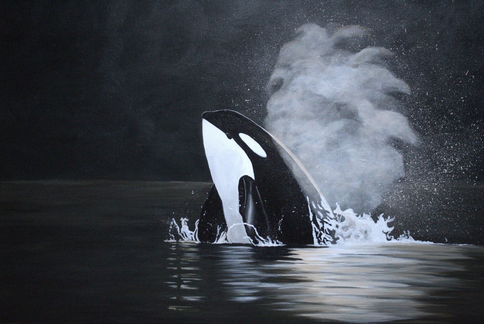 Bonjour Marie ! C'est vraiment beau et étonnant … L'idée de peindre une orque qui surgit des fonds marins, le tout sur fond noir où l'animal semble avoir été flashé dans le mouvement … Bravo l'artiste