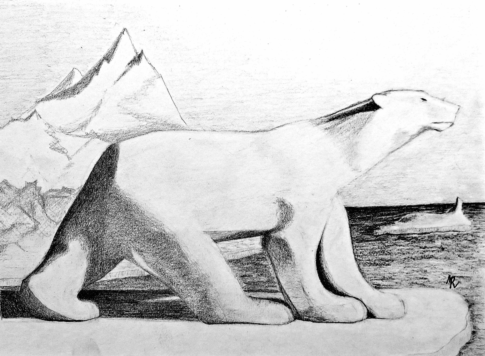 Crayon, septembre 2013, 21 x 29,7 cm. Inspiré de la statue de François Pompon (un sculpteur français). Animal, Pôle nord, Arctique, banquise. === Pencil, 2013. Inspired by François Pompon’s statue (a french sculptor). Animal, North, Arctic Pole, ice floe. === Muriel REULET Artnaturl