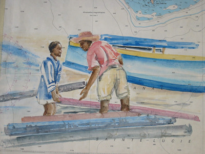 sur cartographie marine St Lucie Antilles. Aquarelle 28x38cm