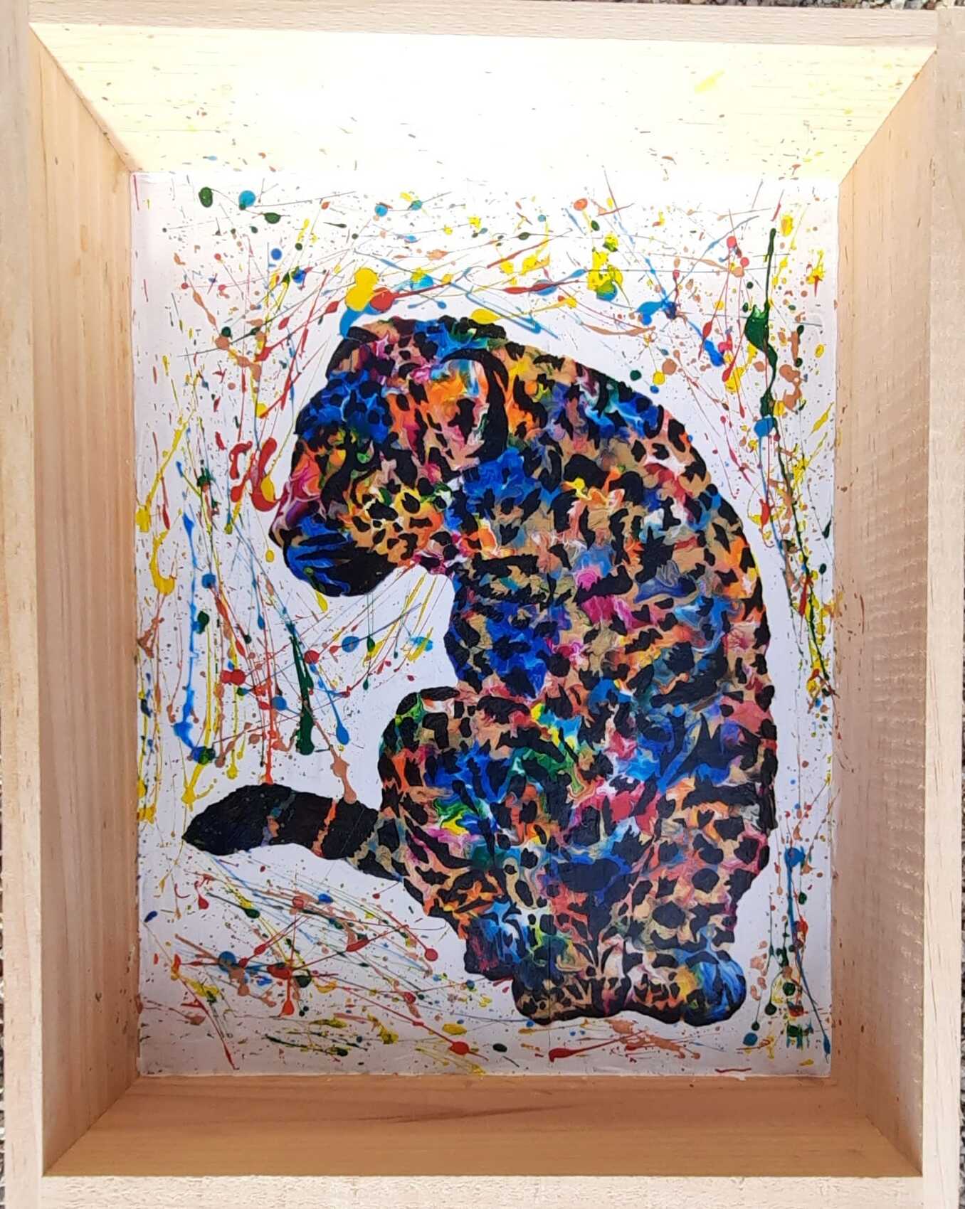 Tableau Panthère multicolore, peint avec de la peinture acrylique sur une caisse de vin en bois. Dimension 30x40cm
