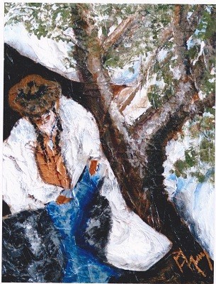 Papier de soie froissé sur bois toilé.Peinture acrylique. Peins en suivant les formes du papier froissé qui a donné un incas lavant son linge à côté d'un arbre. Dimension: 19X24cm. Prix: 65 €. Frais de port inclus.