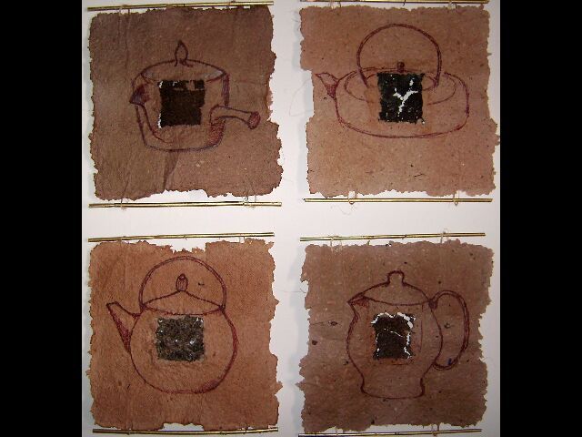 Papier recyclé teinté au thé et papier de thé au jasmin, thé Oolong, thé du Japon et thé à la cardamone. Année 2009. Chaque pièce mesure 24/24 cm.